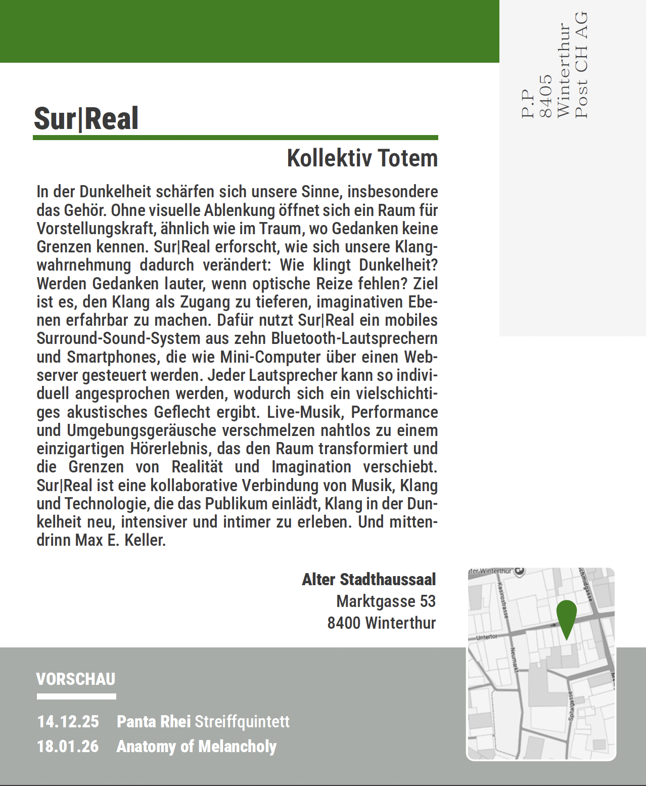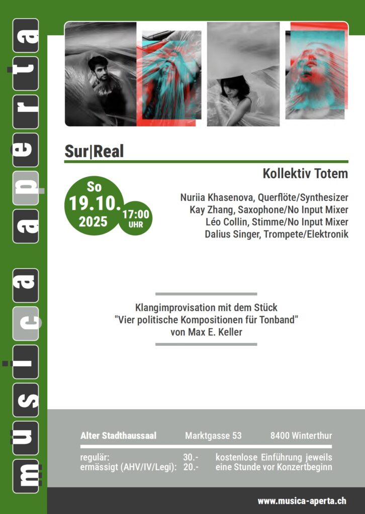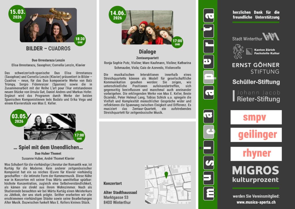 Während 26 Jahren hat Max E. Keller die Interessen neuer Musik in Winterthur vertreten. Musica Aperta ist eben genaus dies: Offen für Musik von Heute und Anderswo. Nun tritt Max zurück. Egidius Streiff, Julia Pfenninger und Johannes Herrmann präsentieren mit der 27. Saison zunächst einmal: Max E. Keller. Als Referenz an den Winterthurer Komponisten haben wir allen eingeladenen Ensembles carte blanche gegeben, mit einer einzigen Auflage: Beschäftigt Euch mit der Musik von Max E. Keller. Die Konzerte sind jeweils Sonntag Nachmittag im alten Stadthaussaal Winterthur. Damit Ihr, Sie und auch Eure Kinder (ab etwa vier Jahren) Euch besser hineinhören könnt, werden wir jeweils eine Stunde vor Konzertbeginn eine Klangeinführung von etwa 25 Minuten machen. Seid herzlich willkommen! Und nun die Gretchenfrage: Bitte unterstützt auch weiterhin die Aktivitäten von Musica Aperta Winterthur. Dies könnt ihr auf zwei Arten tun: – Kommt an unsere Konzerte – Werdet Mitglied (es gibt zwei Freikarten!): Schreibt bitte an musicaapertawinterthur@gmail.com